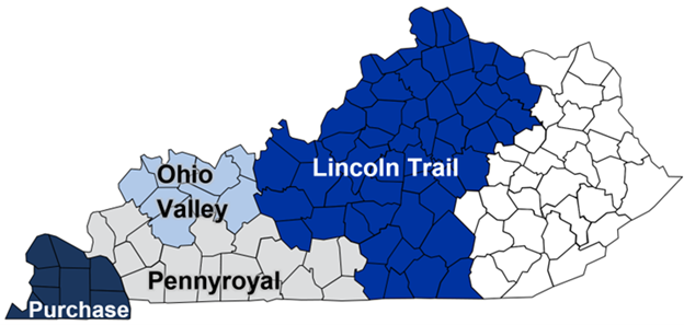 Projected corn yields vary drastically from region to region and when the corn was planted. The early corn planted in the Purchase region started out at over 200 bushels/acre, while the later corn dropped to as low as 120 bushels/acre. The Pennyroyal region has seen a lot of farms with over 200 bushels/acre and some farms claim this might be their best corn crop. Others in the Pennyroyal area have encountered average or subaverage yields due to drowned corn acres, disease pressure, and late planting from wet fields. The Ohio Valley region is projecting yields around 180 bushels/acre, which is below the five-year average. The corn in the Lincoln Trail region seems to be hurt the most by the wet spring and hot/dry summer with projected yields ranging from 70-170 bushels/acre. It is projected that most farms in that area will be closer to the 70 bushel/acre yield.